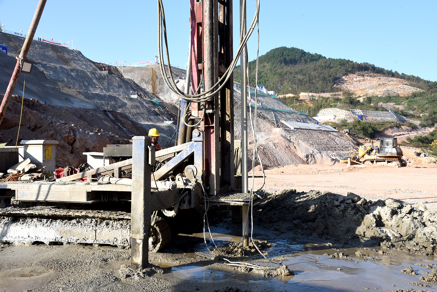 在黔东南州宣威水库建设现场,上游围堰施工区域内,高压旋喷灌浆机持续运转,将水泥浆精准注入预定深度,形成坚固防渗墙,为后续大坝施工筑牢基础。