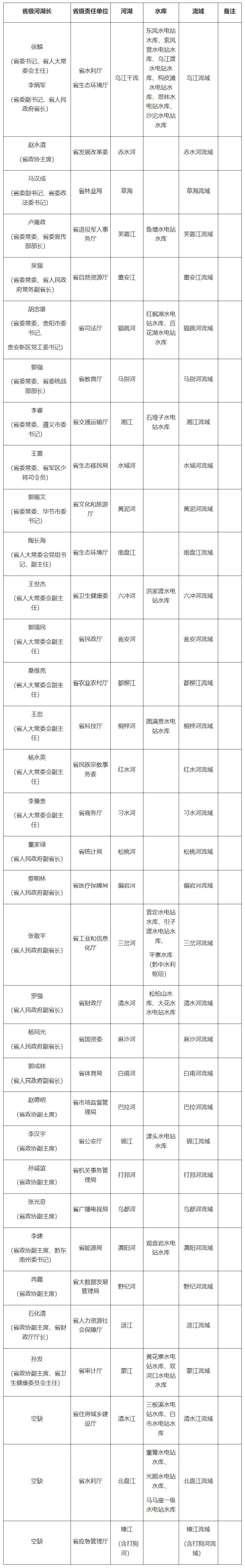 注:今后如因非换届原因出现省领导工作调整,该岗位省领导担任河长的河流由继任省领导接任河长。