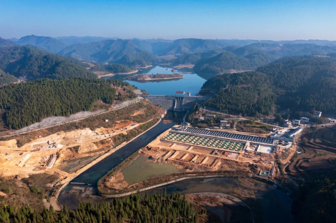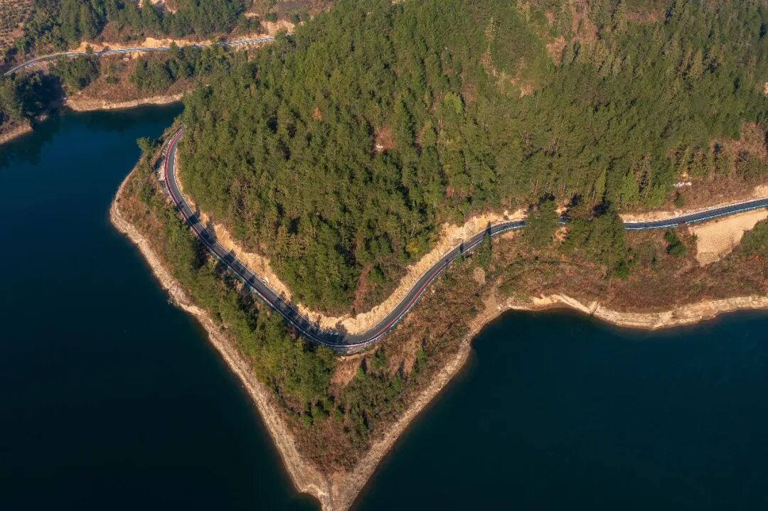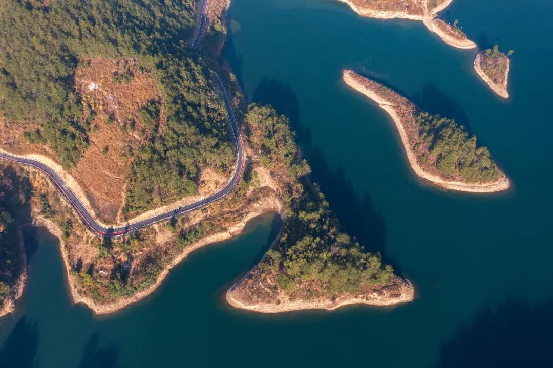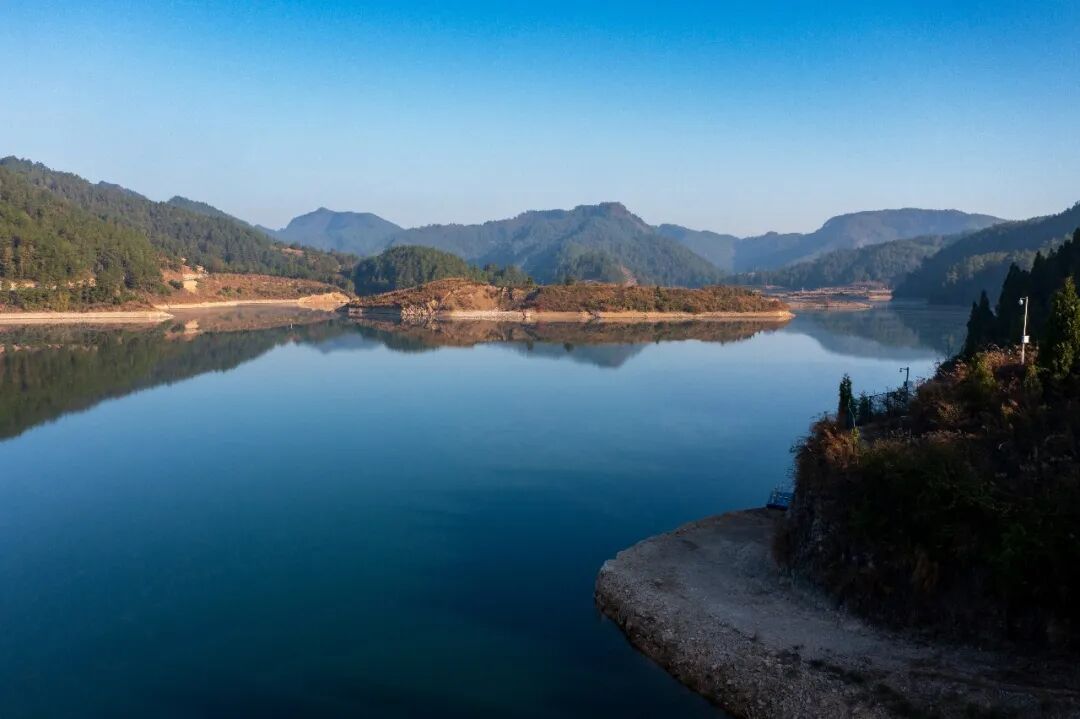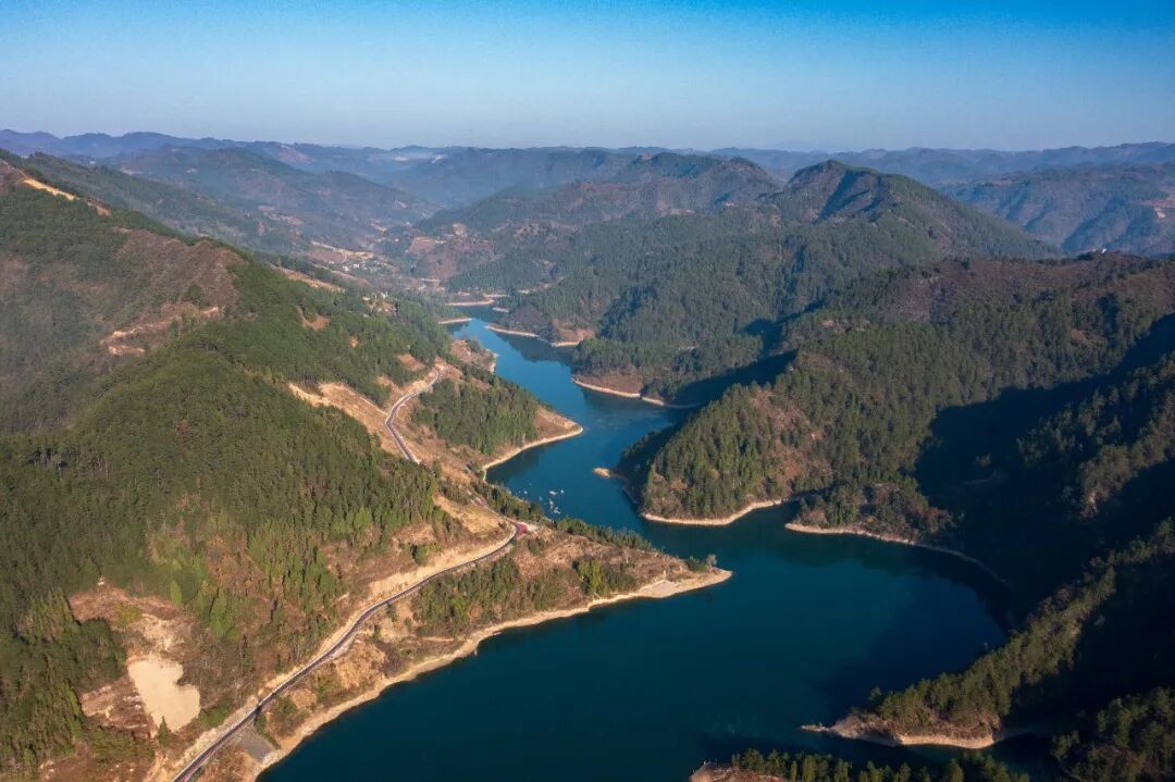 冬日时节,岑巩县大有镇下溪水库,碧绿的湖水镶嵌在色彩斑斓的群山之间,与夕阳的余晖、错落有致的村庄、蜿蜒的道路等相映成景,构成一幅壮美的生态画卷。